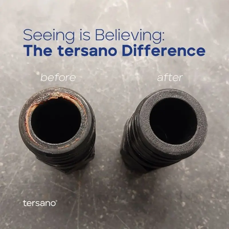 Tersano ได้เผยแพร่ภาพเปรียบเทียบปลั๊กสายน้ำสองชิ้น — ชิ้นหนึ่งจากน้ำเข้าที่ไม่ผ่านการบำบัด อีกชิ้นจากน้ำออกที่ผ่านระบบบำบัดน้ำ lotus® ความแตกต่างเห็นได้ชัดด้วยตาเปล่า ชิ้นหนึ่งเคลือบด้วยเมือกสีน้ำตาลเทาของไบโอฟิล์มและแบคทีเรียที่มาจากน้ำประปาทั่วไป อีกชิ้นหนึ่งใสสะอาด